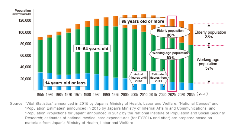 The entire baby boomer generation will be over 75 years of age in 2025. Japan will be a super-aged society where one in