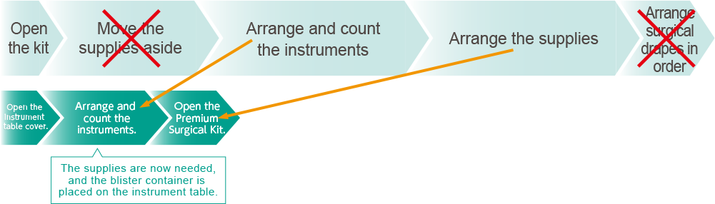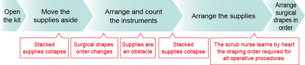 Similar to Premium Surgical Kit, conventional surgical kit products could be packaged according to order to a certain extent. However, an on-site survey revealed that the number of rearranged materials was immense and the order was different. For this reason, nurses had to memorize the order of draping and rearrange items.