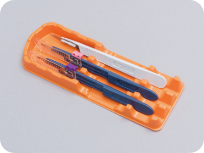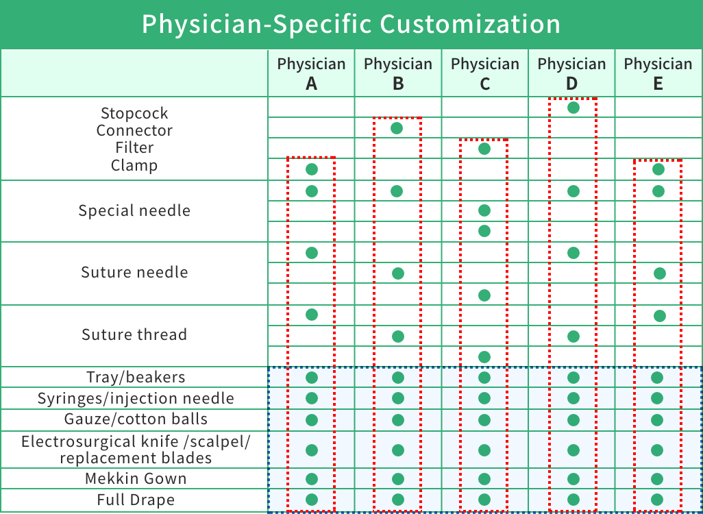 Surgical kits are developed through on-site observation, research, and analysis, in collaboration with our customers, to realize ideal operating room management. We carefully select materials and verify usage procedures to meet a wide range of needs across departments, surgical techniques, and individual physicians. More than 26,000 kits are manufactured annually. We also place great importance on each component, and work closely with frontline physicians and nurses to develop original items designed to enhance medical safety.