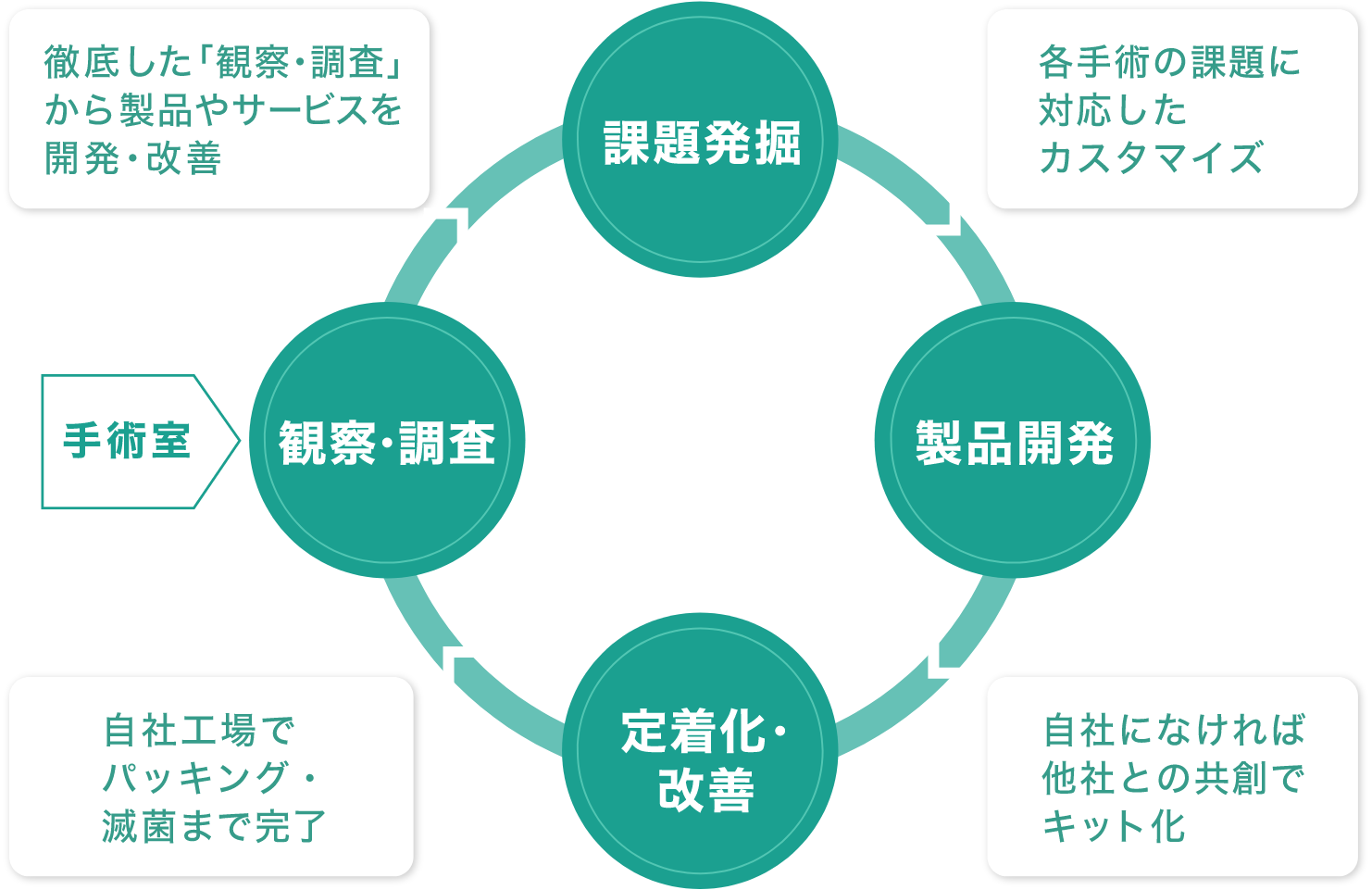 私たちの製品づくりは「みる」ことから始まります。医療環境から現場の小さな課題まで、お客さまに関わる全ての状況を「みる」こと、そしてお客さまが必要とするものを「わかる」こと、それをカスタマイズし、パートナー企業とも連携しながら製品を進化させお届けすることで医療現場をサポートしています。このプロセスを続けることで、キット製品は成長してきました。