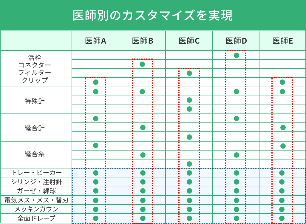 キット製品は、現場の観察・調査と分析結果をもとに、お客さまと考える「理想の手術室運営」に向けて、必要な材料を選定し、使用手順を確認しながら設計しています。診療科や手術手技、医師ごとのご要望など、幅広いニーズにお応えし、年間26,000を超える製品を製造しています。