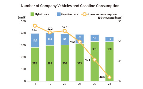 We have gradually replaced our conventional company vehicles with hybrid cars. As of 2023, at least 85.3% of the fleet is hybrid.This led to a reduction in our gasoline consumption. Going forward,we will continue to choose environment-friendly means of transportation, with EV vehicles in mind.