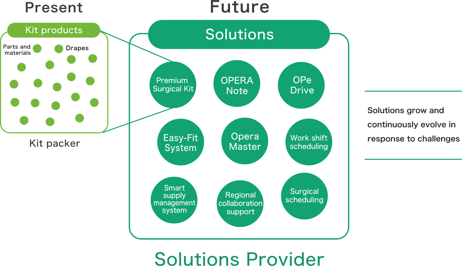 To address the diverse challenges faced in operating rooms, we are evolving from a supplier of internally manufactured and distributed surgical kits to a comprehensive solutions provider. In addition to our own offerings, we aim to flexibly combine and propose a wide range of solutions—such as products, technologies, information, and improvement methods provided by partner companies—tailored to the specific needs of each customer.