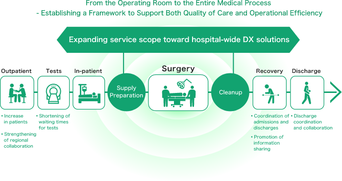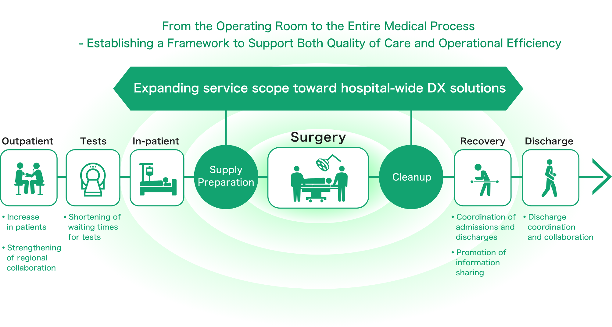 Our products are currently the most widely used in operating rooms. By linking the data obtained in the operating room with pre- and post-operative medical processes, we believe we can deliver greater value in healthcare management. We are exploring opportunities to provide support across the entire medical process—from outpatient care and testing to hospitalization, surgery, and discharge—and, having defined our aspirations in the current Medium-Term Business Plan, we will continue to expand our products and services beyond 2035 to contribute to both healthcare and society.