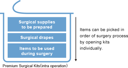 Similar to Premium Surgical Kit, conventional surgical kit products could be packaged according to order to a certain extent. However, an on-site survey revealed that the number of rearranged materials was immense and the order was different. For this reason, nurses had to memorize the order of draping and rearrange items.
