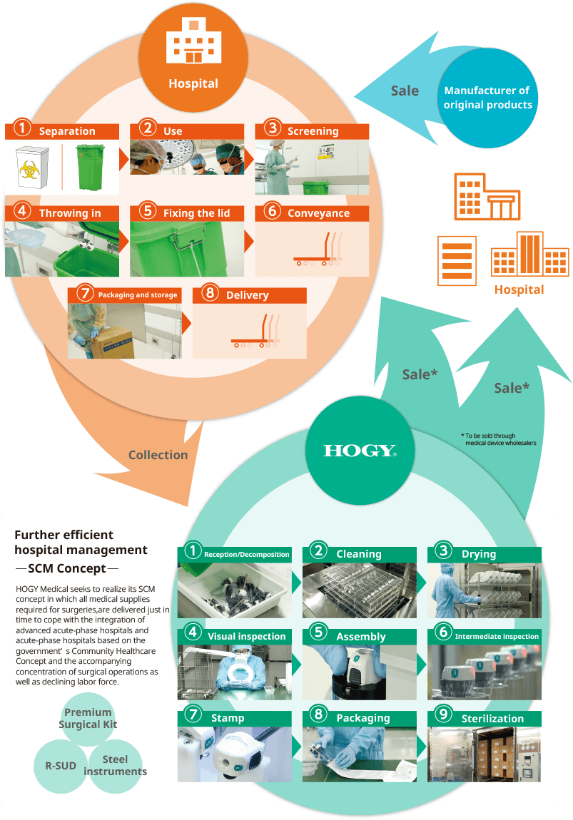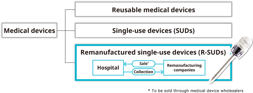 Used single-use devices (SUDs) are collected from medical institutions by medical device manufacturers, and then checked, cleaned, sterilized, etc. (remanufactured) so that they can be reused as SUDs.