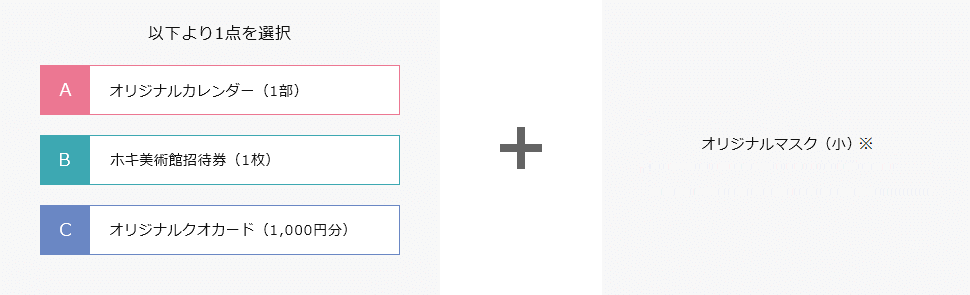 *以下より1点を選択 ①ホキ美術館招待券(1枚) ②クオカード(1,000円分) + ○オリジナルマスク(小セット)※ |