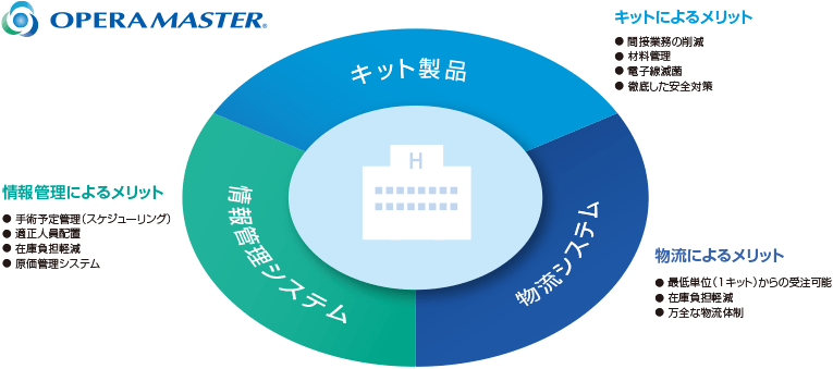 私たちホギメディカルの「オペラマスター®」は、手術室周辺の各種情報を素早く正確に収集する手術管理の仕組みと、業務の簡素化に貢献する製品を持って具体的に医療施設をサポートしていくシステムです。